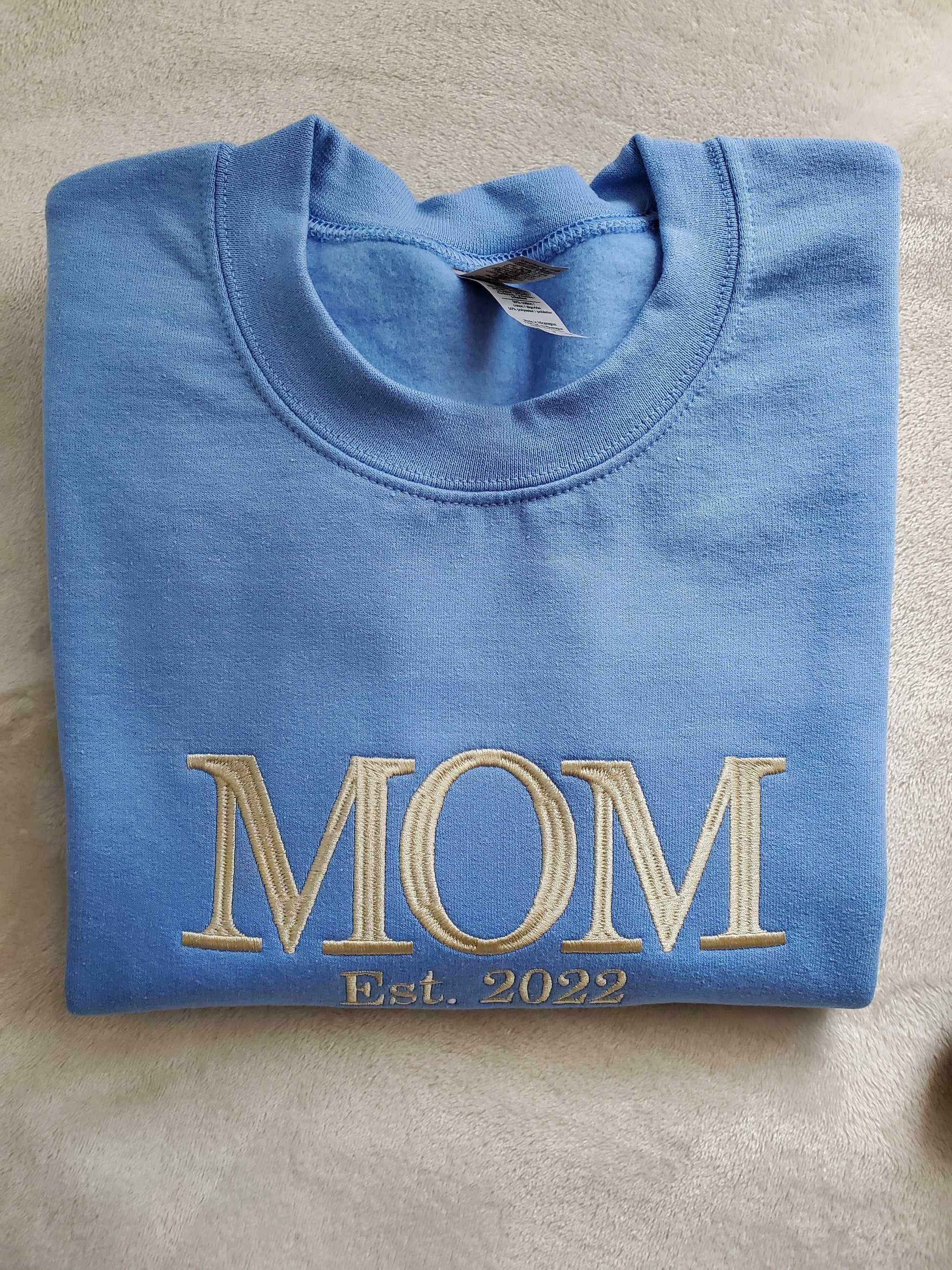 Custom Embroidered Mom and Dad Sweatshirt with kids names on the sleeve makes the perfect gift for new Mom and Dad for Mother's Day or Father's Day or special occasions including gender reveal and pregnancy announcements.